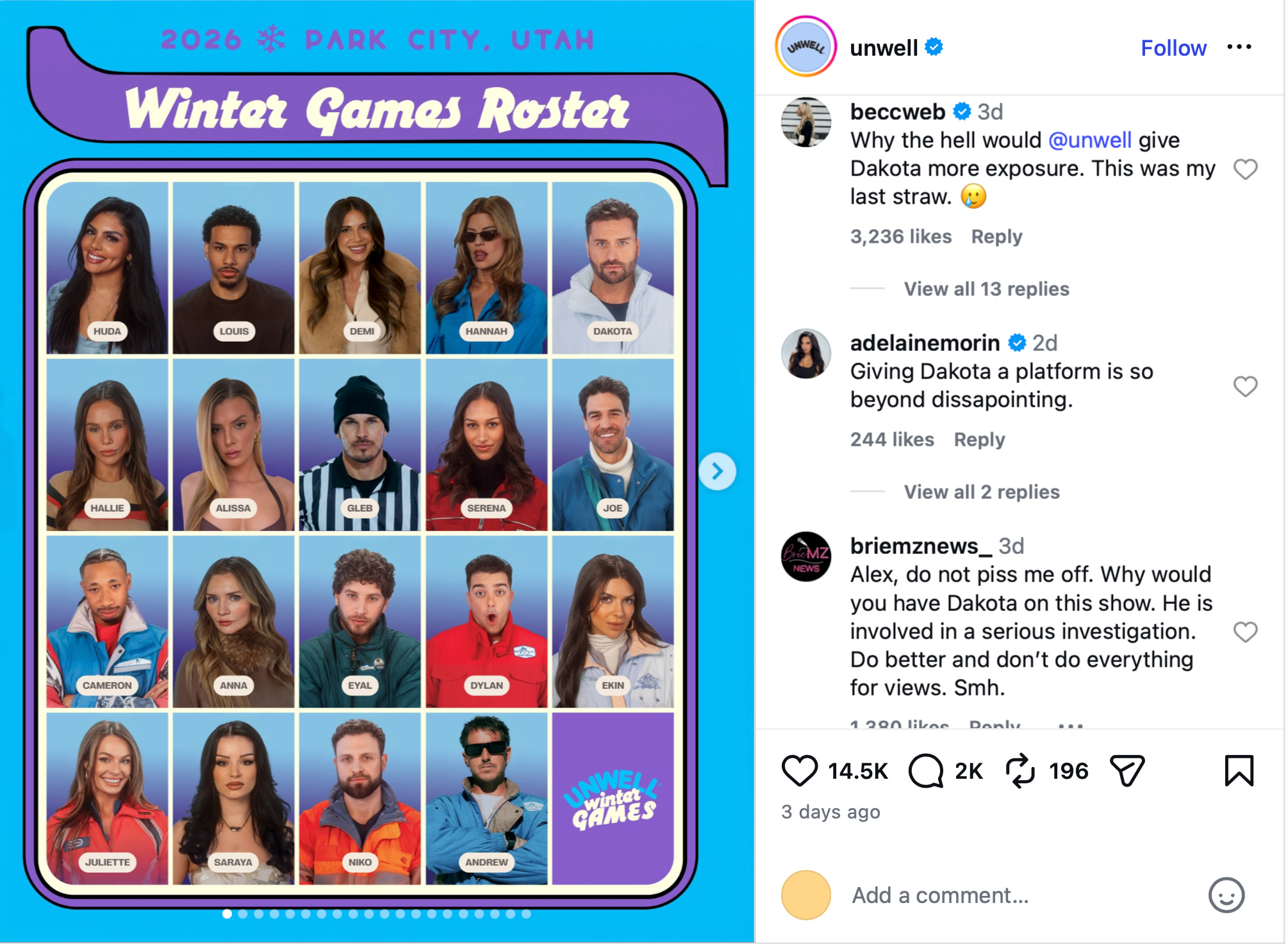 Before I was mad about Scamanda (omg taylor stfu about Scamanda) I was mad at Alex Cooper, and I still am. This week she announced the cast of her upcoming show Unwell Winter Games, which includes a long list of polarizing reality tv stars, most of all I have an issue with. Anna Delvey (convicted felon), SLOMW’s Demi Engemann, Hallie Batchelder, and Huda are at the top of my list of people who I don’t think we should be giving a platform to but the person to take the #1 spot… Dakota f*cking Mortensen. Taylor Frankie Paul’s ex. Yeah, the girl whose season of the Bachelorette was just taken off of air because of domestic violence, the other side of the story comes from Dakota - who, let me just say, has been and always will be the problem. Sooooooo why on earth are we letting this man compete on a reality competition but TFP’s whole show got taken away? Seems absolutely absurd to me. Not that I was going to watch to begin with, but now I absolutely will not be watching unless Alex Cooper edits out every scene with Dakota in it.